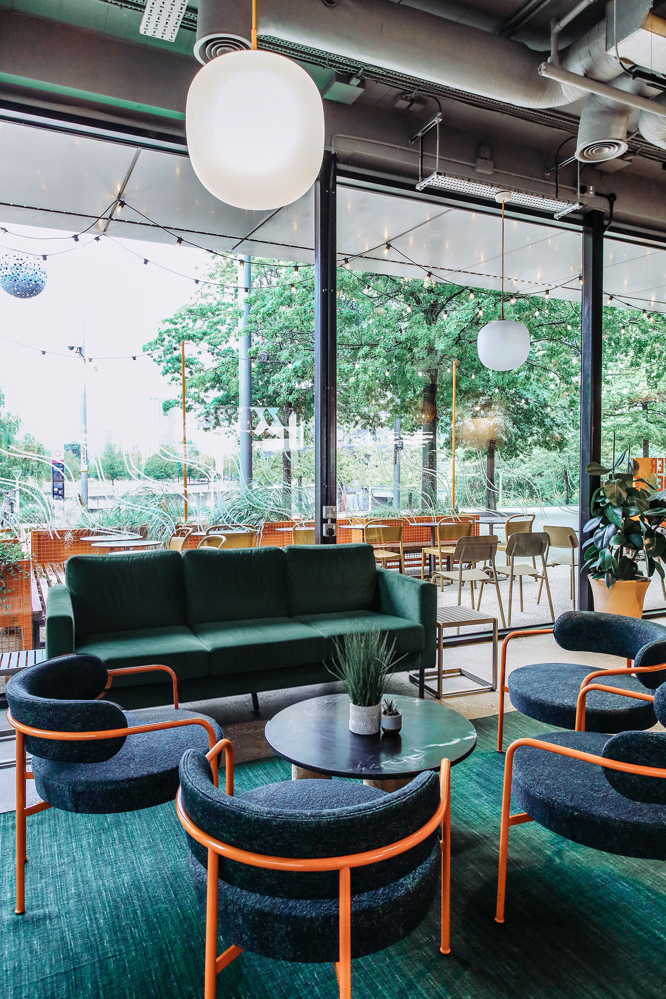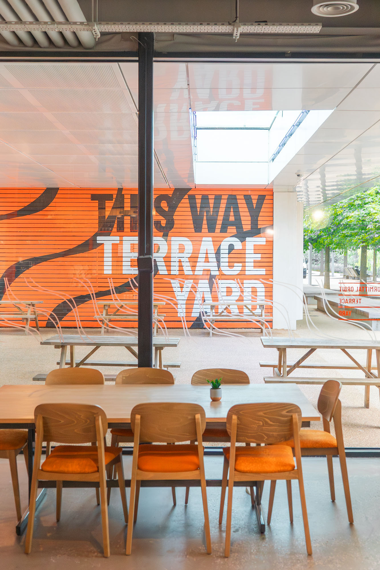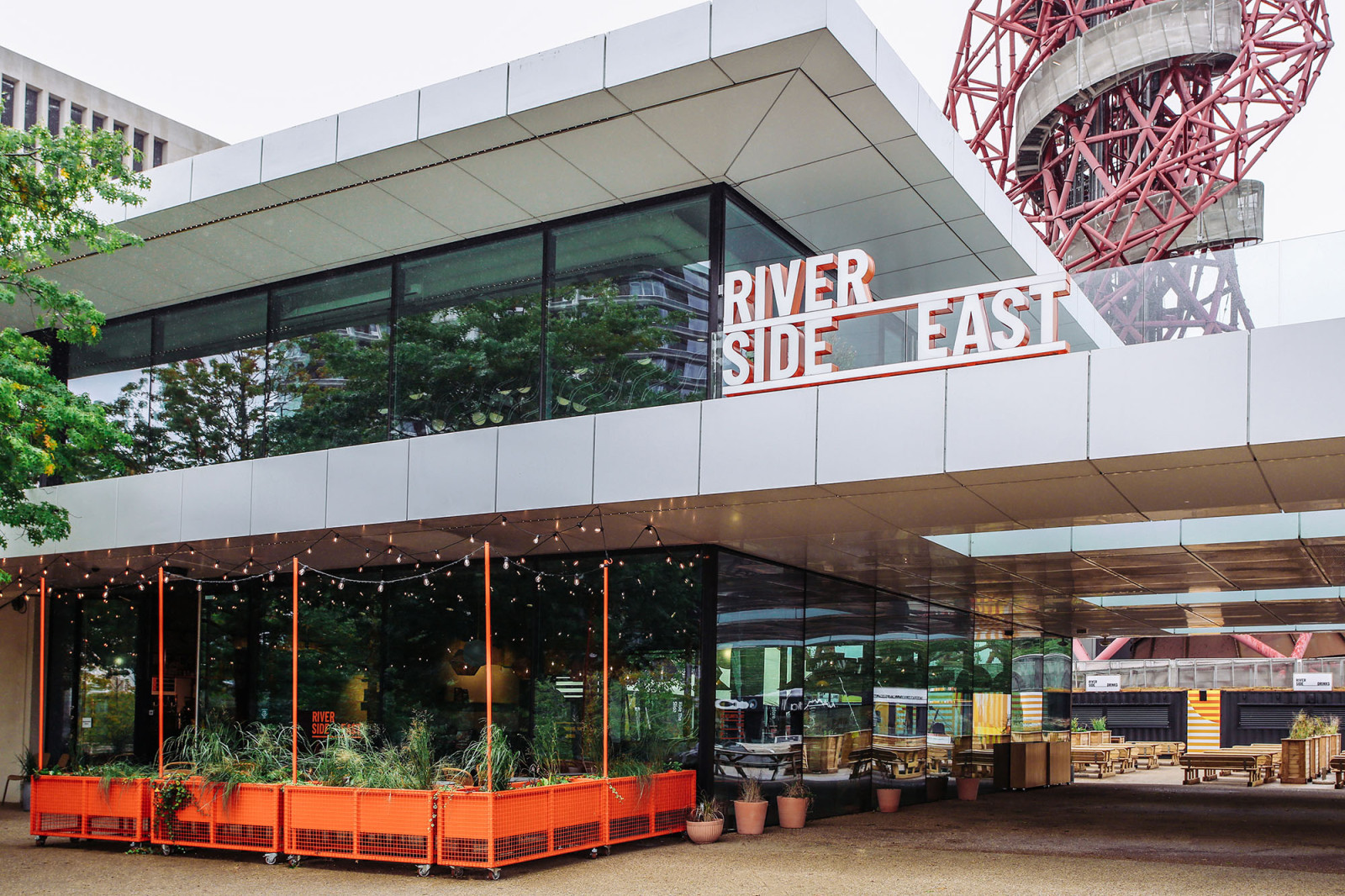 Branding and interior for multi-purpose venue in the Olympic Park. Riverside East is a large café on the ground floor with Wildnote restaurant above, and an outdoor street food market behind. The venues share a common ethos and colour palette, weighted differently to offer varied experiences. The bold and simple branding allows for flexibility of application, stretching to accommodate messaging.