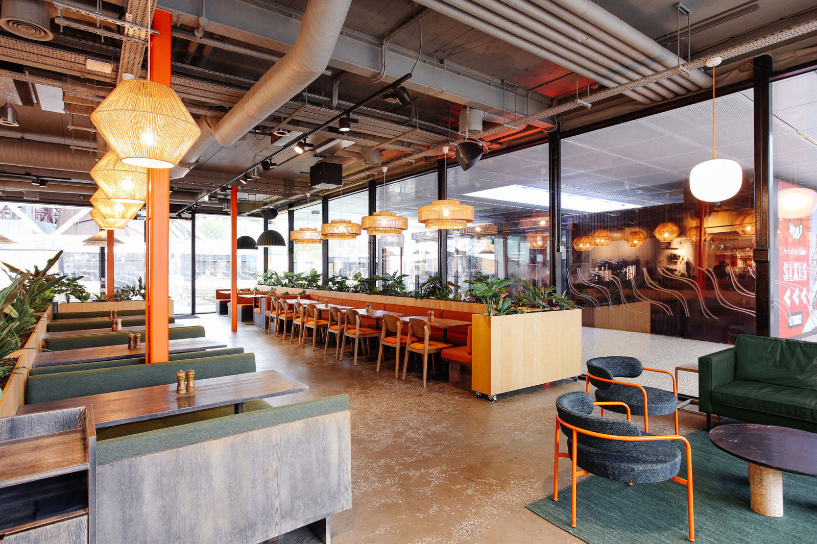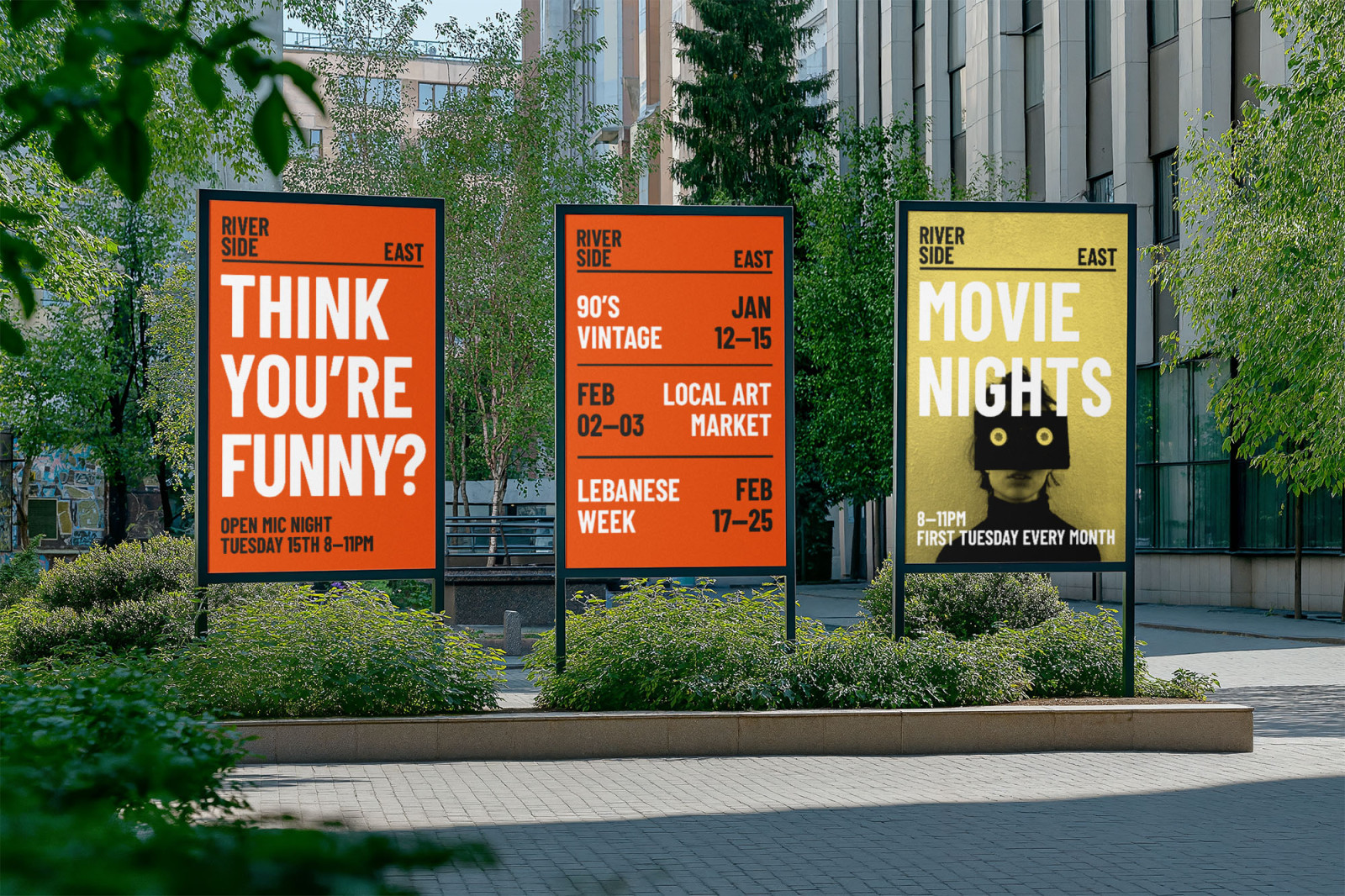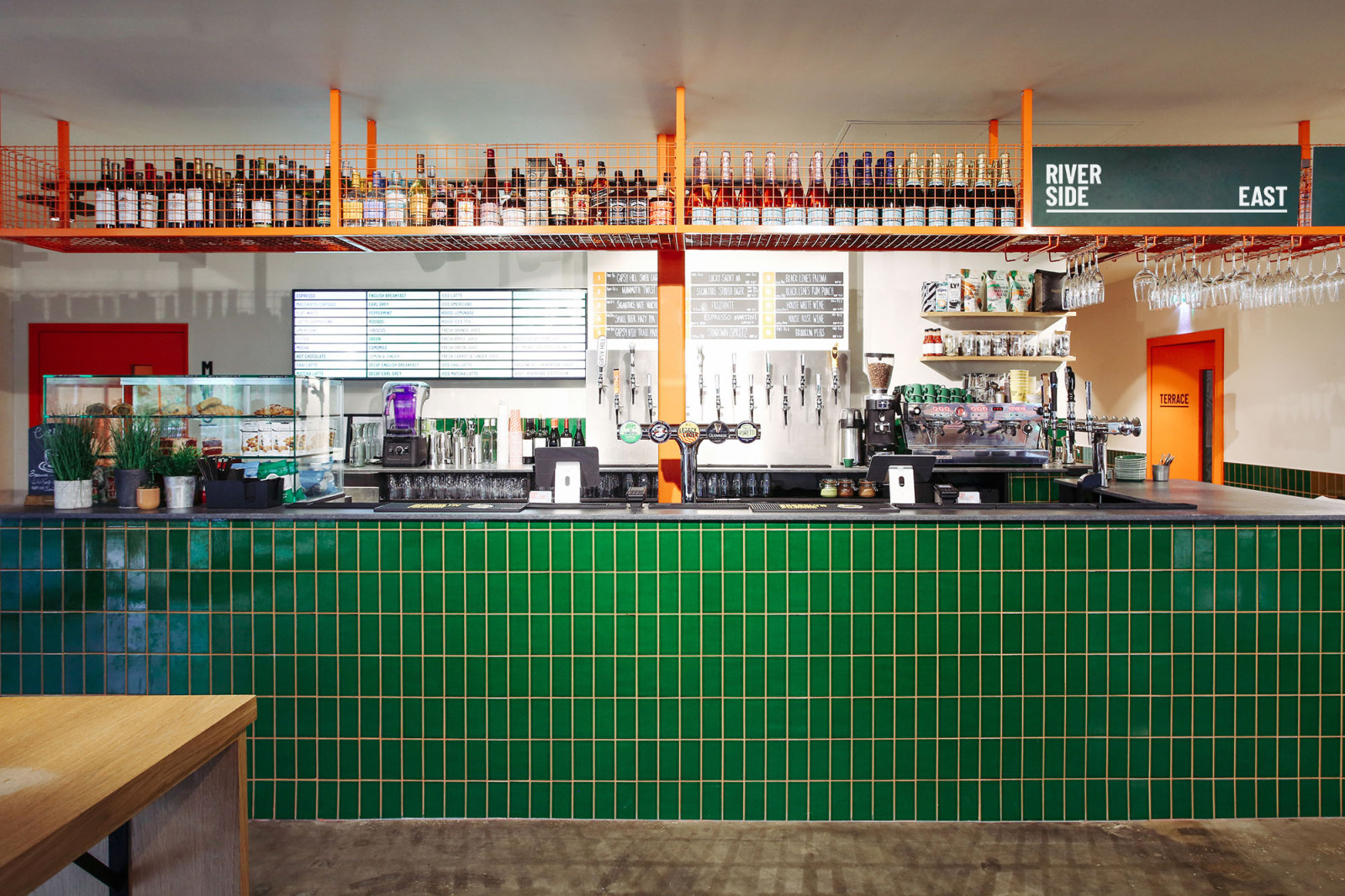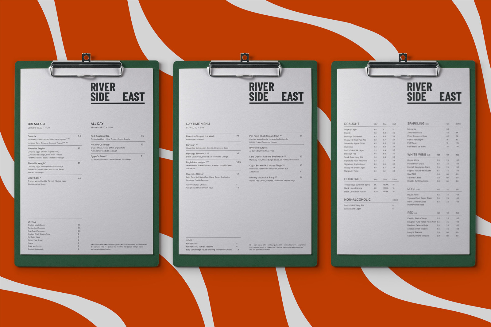 Branding and interior for multi-purpose venue in the Olympic Park. Riverside East is a large café on the ground floor with Wildnote restaurant above, and an outdoor street food market behind. The venues share a common ethos and colour palette, weighted differently to offer varied experiences. The bold and simple branding allows for flexibility of application, stretching to accommodate messaging.