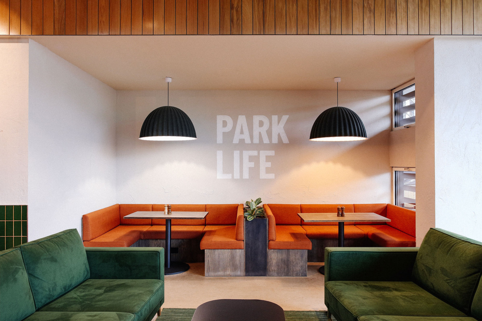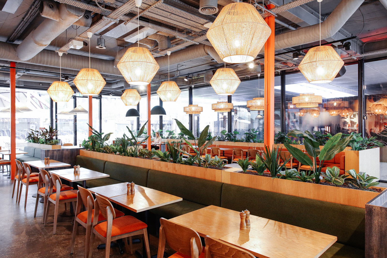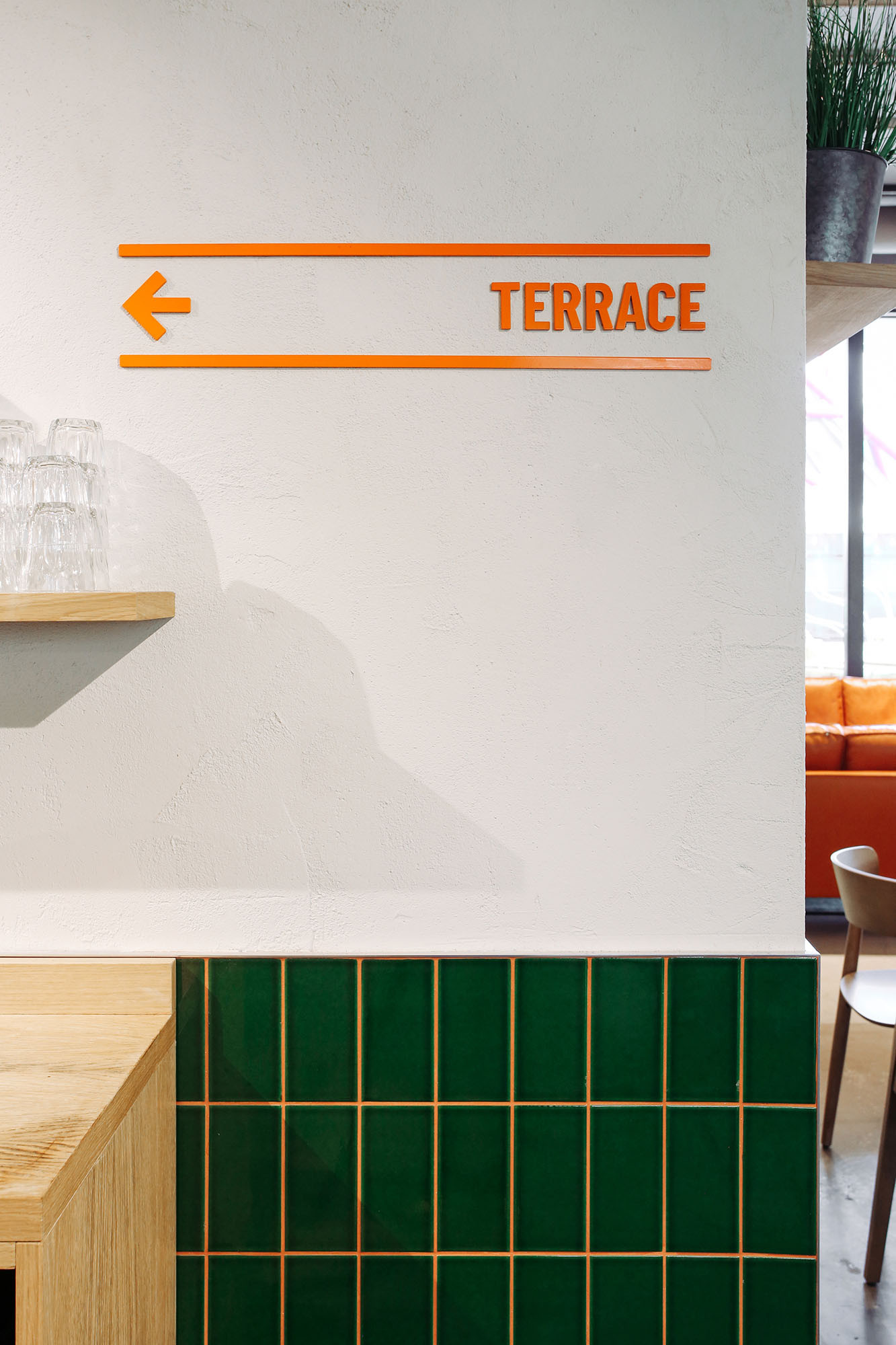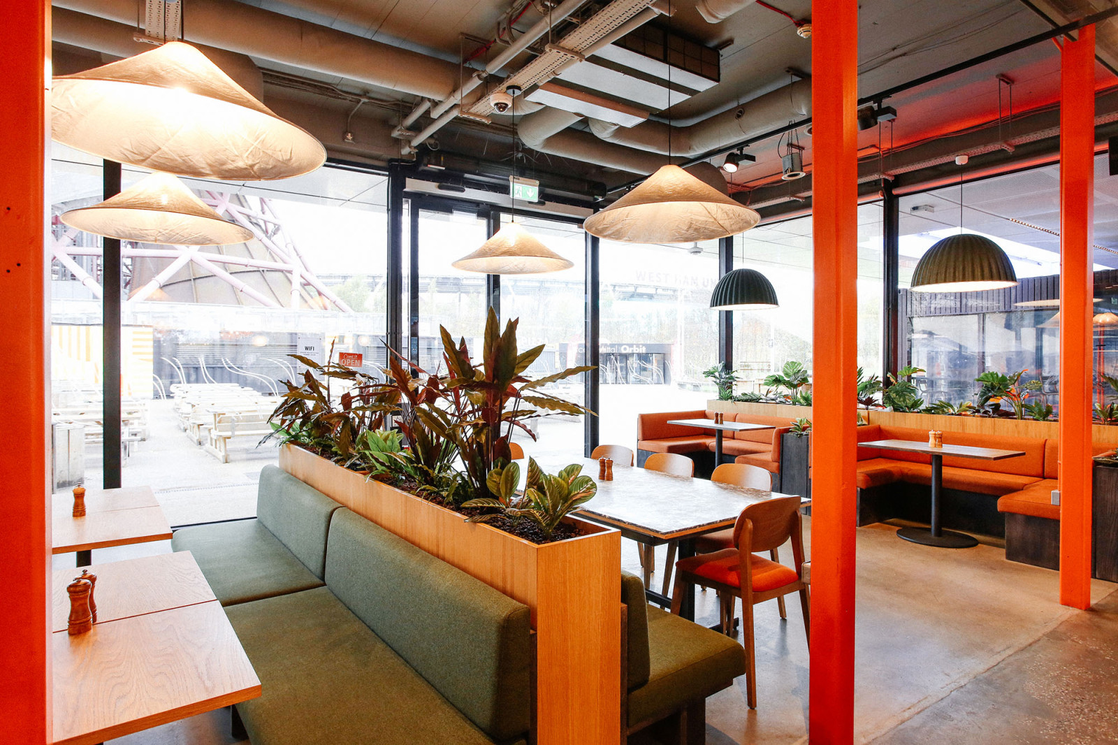 Branding and interior for multi-purpose venue in the Olympic Park. Riverside East is a large café on the ground floor with Wildnote restaurant above, and an outdoor street food market behind. The venues share a common ethos and colour palette, weighted differently to offer varied experiences. The bold and simple branding allows for flexibility of application, stretching to accommodate messaging.